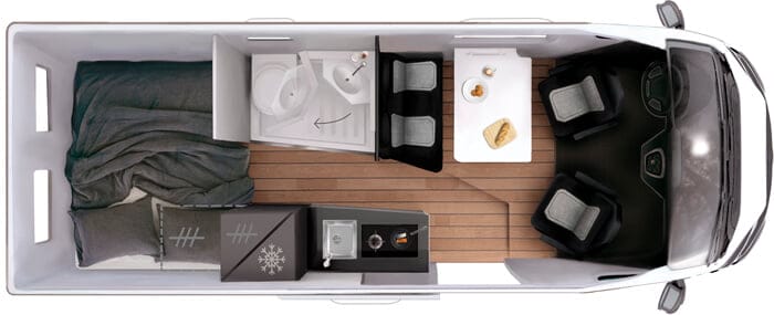 El 59 T lo tiene todo. Su longitud, inferior a seis metros, es ideal y permite disponer de un espacio cómodo a bordo, desde el salón hasta la zona de descanso trasera. Su distribución bien pensada garantiza un comedor espacioso, un bonito cuarto de baño y una cocina muy funcional, sin olvidar los múltiples espacios de almacenamiento.