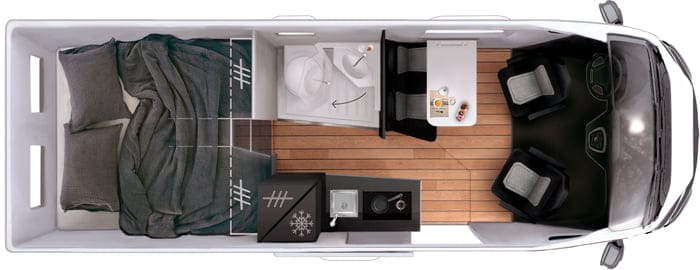 Con sus 6,36 m de longitud, la 63 Family cuenta con literas modulables y múltiples espacios de almacenamiento, indispensables para garantizar un confort óptimo cuando se viaja con varias personas. Cabe destacar también que, para optimizar el espacio y la practicidad, este modelo está equipado con calefacción Truma Diesel.